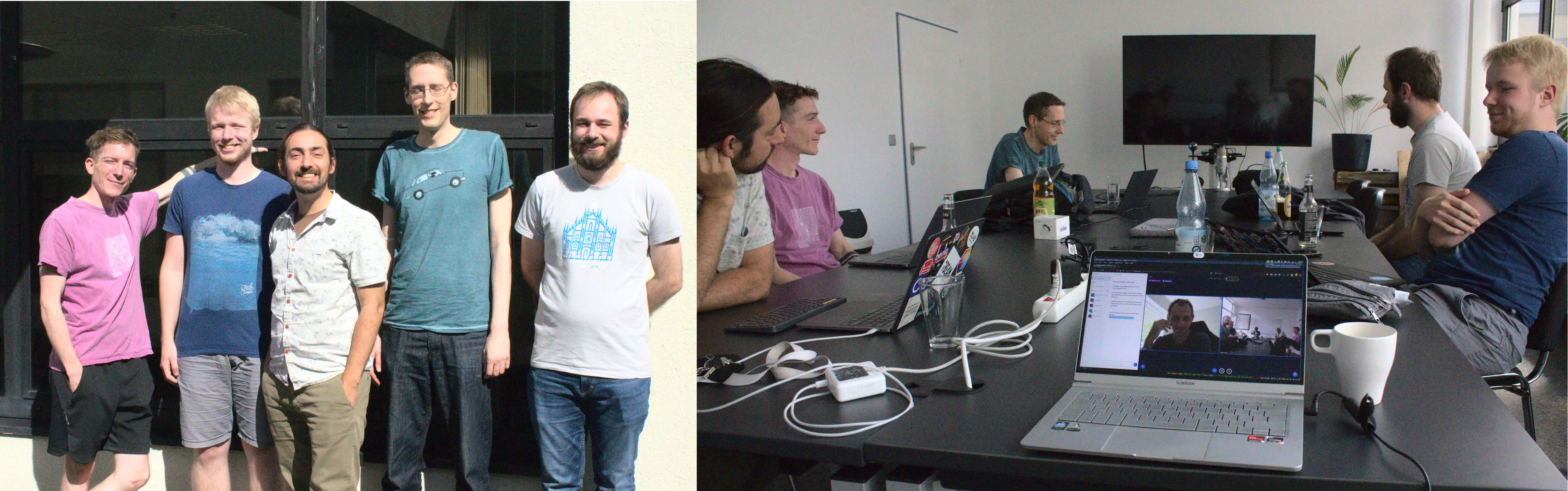 (left) Group photo of in-person attendees on that beautiful sunny Saturday afternoon; (right) we also had several virtual participants, including Alexander from LabPlot, who can be seen in the BigBlueButton room on the laptop screen. Although it would have been nice to use the big screen at the head of the table for the conference call, we were not able to get it to work. (Image: CC BY-NC-ND 4.0)