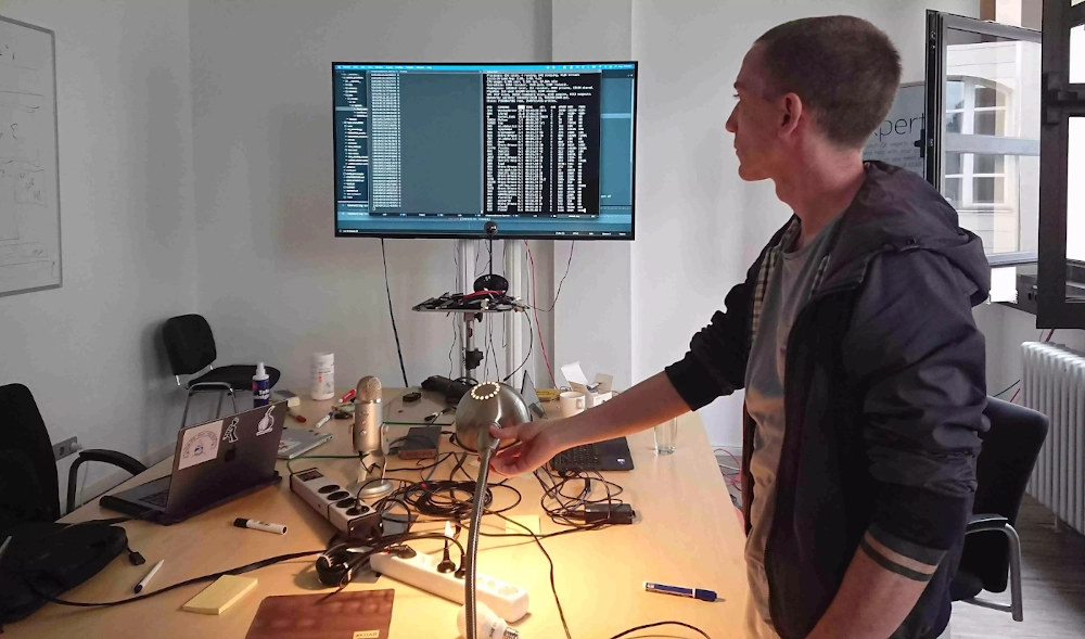 Arne testing the GUDE Python script by measuring the power consumption of the KDE Eco calibration lamp (Image: CC BY-NC-ND 4.0)