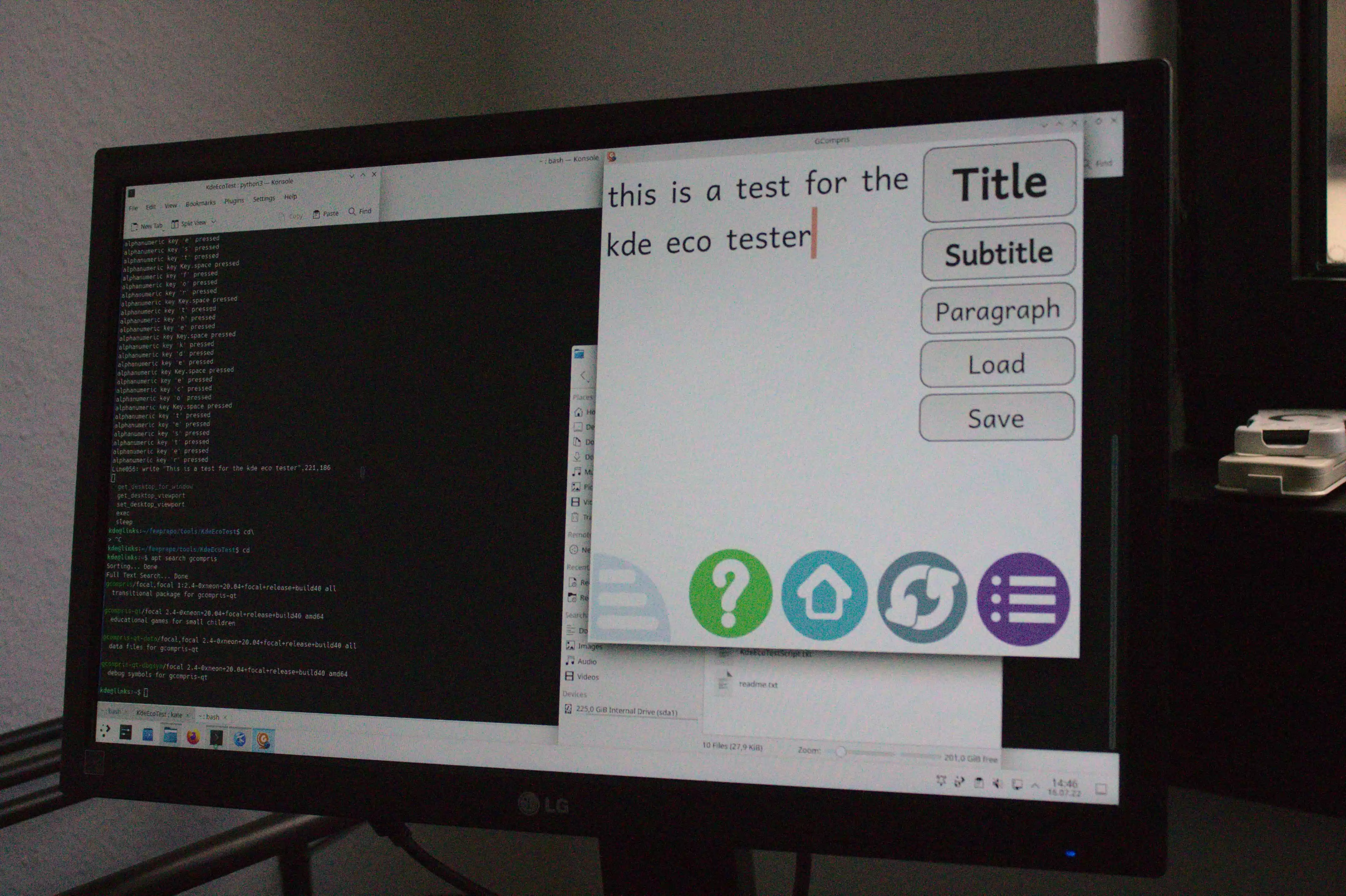 However, we did make headway in the usage scenario scripts. These scripts emulate user behavior, and, over the past several months, Emmanuel has been working on the development of KDE Test Creator / KDE Test, which is written in Python and uses xdotool to trigger actions in the software being tested. A benefit of the KDE Test tools over others like Actiona is that the scripts are transferrable across different systems being tested, while also being easy enough to use to make scripting quick.